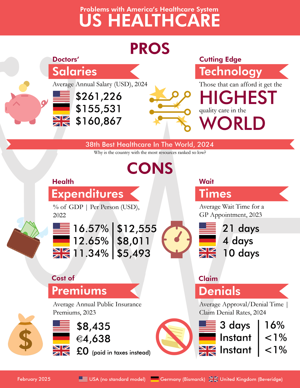 I was commissioned to create reference sheets explaining US’s healthcare system, and how it compares to the rest of the world. The goal is to establish how the US’s healthcare system is lacking compared to other countries, and to use ideas from other countries to better our own. The commissioner, a medical doctor, would then use these sheets as reference to advocate to politicians to try changing how the healthcare systems work at least in the local area.